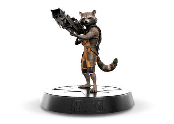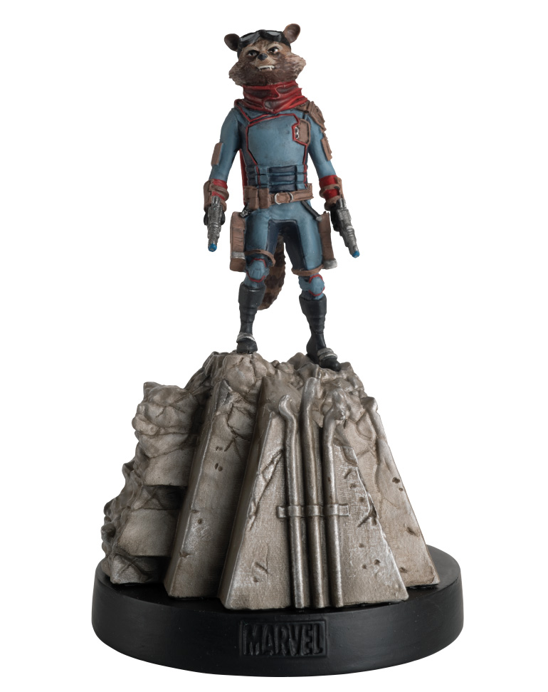 La figurine exclusive de Rocket dans Les gardiens de la Galaxie. Elle est à la même échelle et mêmes proportions que les autres figurines de la collection… Et il est lourdement armé !